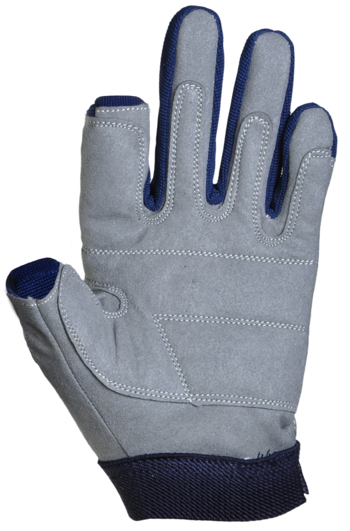 Segelhandschuhe, Navy/Grau, mit Fingerkuppen, Daumen und Zeigefinger frei.